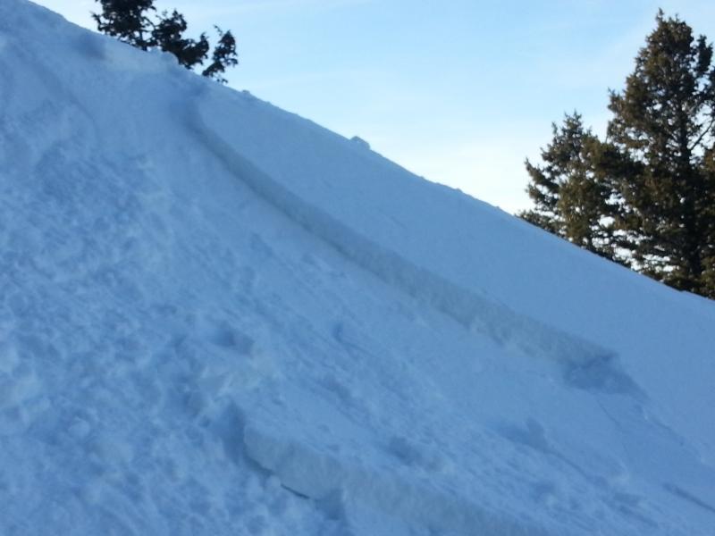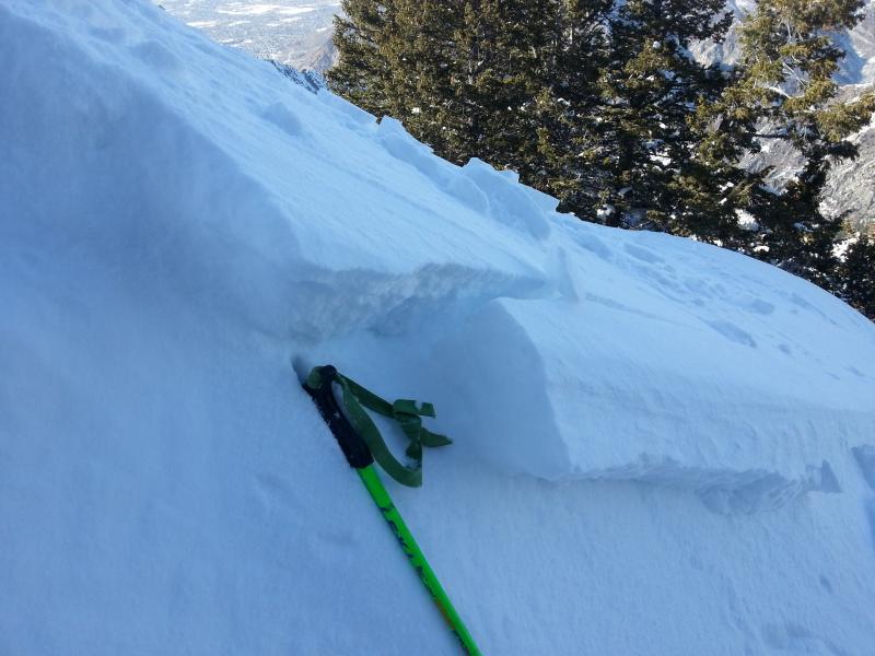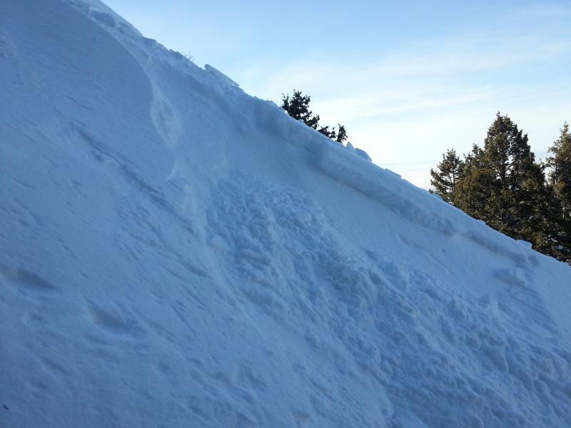 Below, the largest pocket was 8" deep, about 15 feet wide, and did not really run either; most of the snow did not go more than 15 feet. Perhaps I should mention that I did belayed cuts (and belayed booting back up, which really compacts the snowpack) in this same spot a few days ago, so I was reasonably sure that any movement would only be in the new snow from the last 5" storm cycle. Windloading could certainly be much more, but in this particular location, I did not get results over 8" deep. There is another rollover down the slope to the right, that I did not feel good about getting on, because I have not seen tracks in that spot all year.
