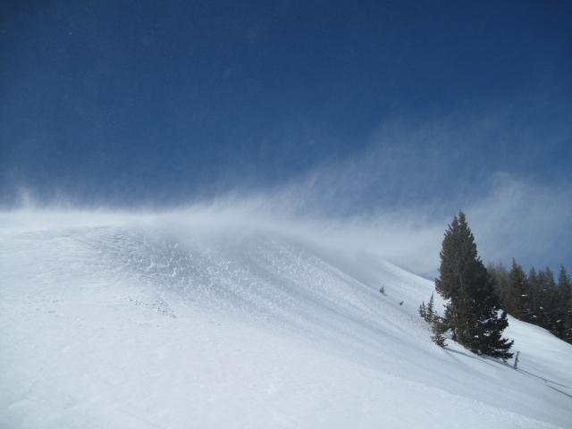 A very windy start to the day, with blowing snow across the road driving to the trailhead. Very strong south and southwest winds around mid-morning drifting lots of snow onto north thru east aspects. The winds stayed quite strong through most of the day with good visibility.