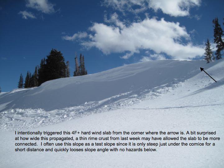 This 4F+ hard wind slab was intentionally triggered as I stepped onto the slope from the corner. It broke nearly 100' wide, two feet deep, but only ran a short vertical distance due to the low slope angle. Strong winds were creating these sensitive wind slabs along and down off the exposed ridgelines.