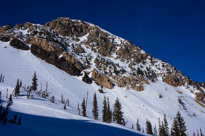 Third photo: many small, wet sluffs triggered by skiers and boarders on south facing Flagstaff as the new snow heated up in the sun