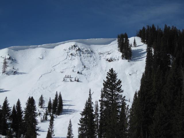 Somewhat old news, but a picture of a shallow wind slab that stepped down into old weak snow as it crashed over the rocks below. It is pretty amazing how even high on the slope there is very weak snow that has been there all season long.