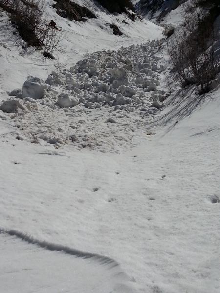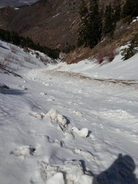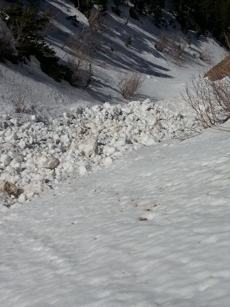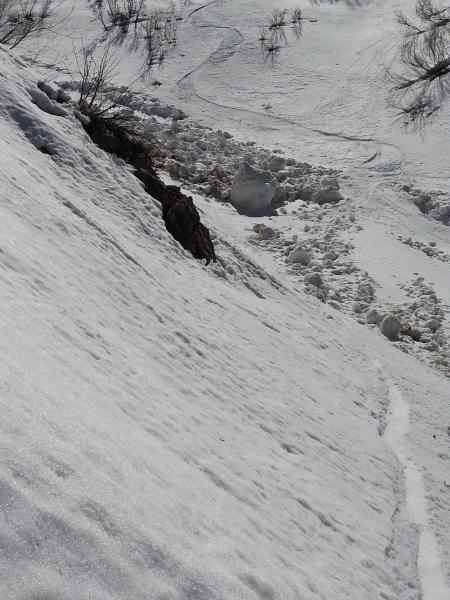 In the Banana chute, a number of old wet slides that came down before the last storm cycle showed the wet slide potential in there. The largest slide came in from skiers right, around 7500 feet.
