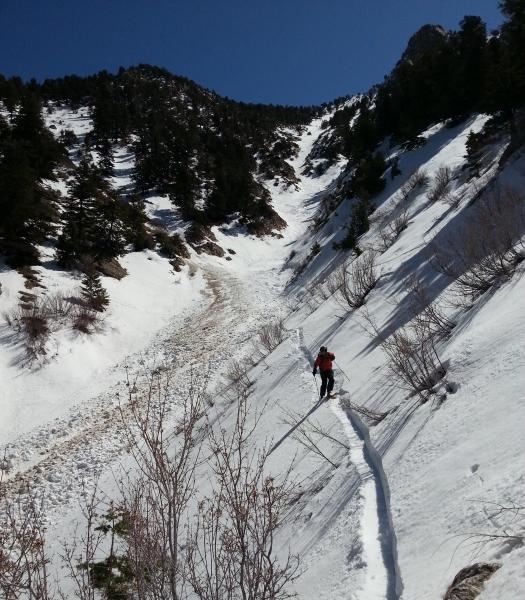 Still surprisingly nice snow in shaded north-facing upper elevations; especially 9400 to 8400'. Heavier but not too sloppy down to around 7500', wetter below there, but its lower angle down there (no old wet debris below 7000', because of the gentler slope angles). We got about a half mile into the runout before having to take off the boards; estimating that was around 6400'. Then we took our time on the hike out, which took 2 hours.