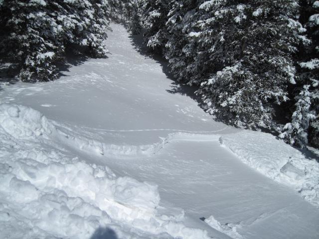 First photo: the new snow was starting to develop into a soft slab and I could trigger these soft slabs on a small test slope. They were entraining a decent amount of snow as they got going. Second photo: I observed several of these natural slides on Moffit Peak. They would start out as a small point release and then entrain the new storm snow with some creating a shallow soft slab to fracture as it gained momentum.