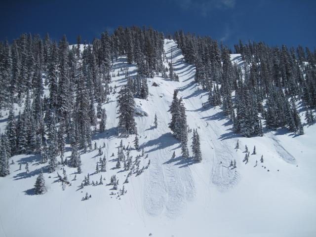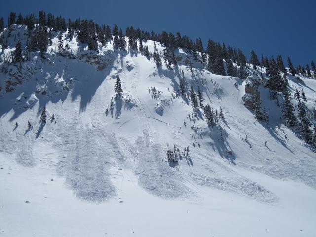 Some of the debris piles from these natural slides were stacking up a bit and a person would not want to be caught up in one, especially in any kind of terrain trap. A couple of these slides triggered a shallow soft slab as they picked-up speed coming down the slope.