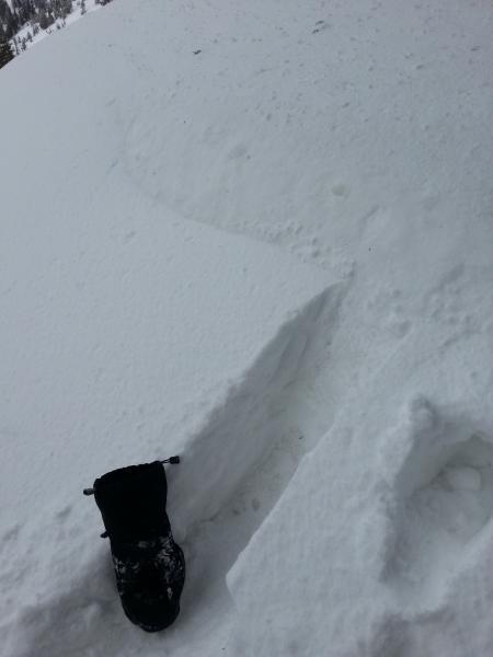 At 9000' to 8700' on N aspects, in slightly more sheltered areas there were pockets of 12" to 14" deep dense wind affected snow, which made for decent turning. Cuts did not produce any cracking, but harder windslab seemed like a slight possibility, since that can be unresponsive to cuts, and unpredictable. I opted for a ridge exit boot.