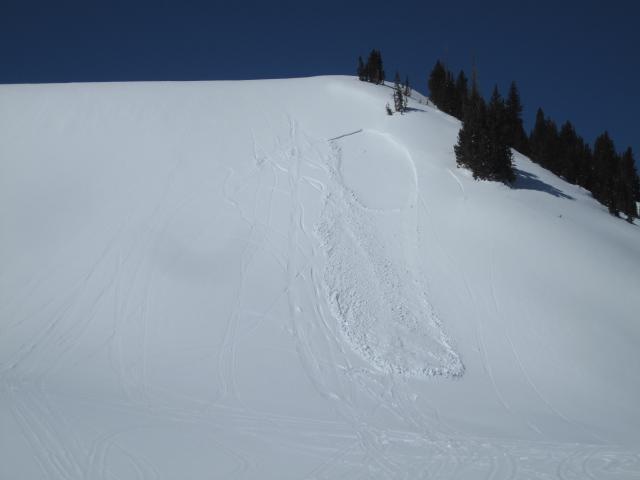 I'm guessing this small sled tirggered wind slab happened over the weekend. South and southwest winds creating fresh wind drifts that were sensitive to the weight of a rider. Second photo is of some recent wet activity, with day time heating cornices are becoming soft and tender.
