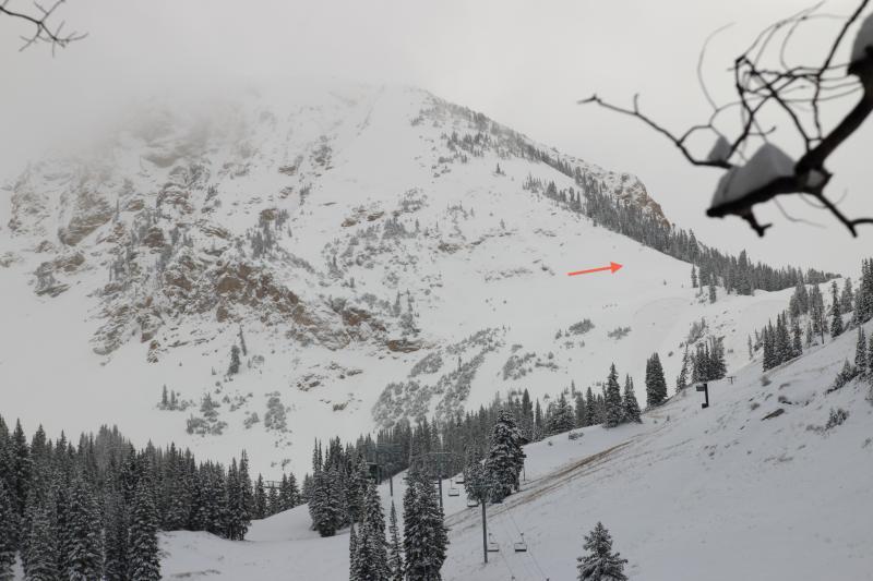 Went to Mt. Baldy to evaluate the weakness resulting in three slides on tuesday 10/29 on Baldy Shoulder. I performed a crude ECT in a location roughly 200' above the two more prominent slides on a 30 degree, NE facing slope at ~10,500'(see red arrow in attached photo), scoring an exciting ECTP-2, with failure on 2mm facets buried 10/28 by a layer of prefrontal dirt and graupel. Upon walking back to the ridge, I felt a convincing collapse while stepping on an obvious wind pillow. Strong winds last night have reshaped much of the upper elevation snow surface, and in this location, I found a total HS of 70cm, with our old snow surface sitting beneath 40cm of recent storm snow, obviously enhanced by the wind and forming a 4f/1f slab. Further up Mt. Baldy, on the spooky, hanging open slope of the High Baldy Shoulder, and in the Main Chute, there appears to significantly more snow than there was yesterday, due to last night's wind. Nearly everything with enough snow to ski at (closed) Alta Ski Area has been well-tracked, but people have stayed away from runs off the top of Baldy, though its evident a few have gone all the way up for a look. I would imagine that if anywhere is holding reactive old snow, it is those locations, where recent wind slabs offer a tempting appearance of coverage, and perhaps enough additional load to get things going.