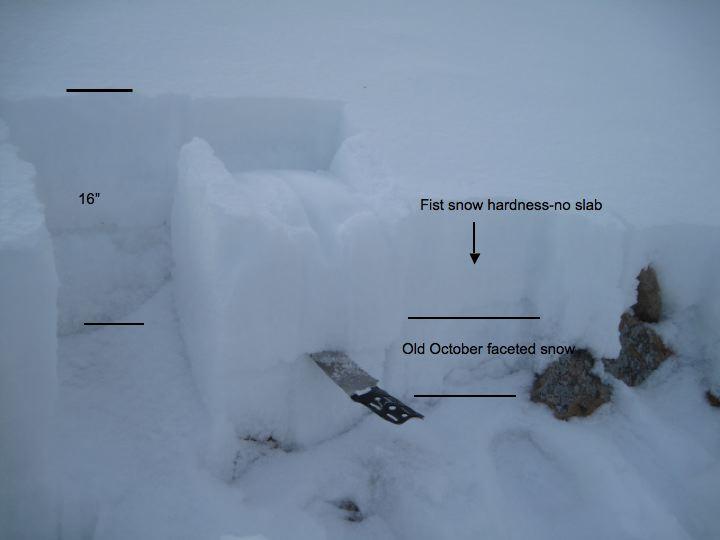 It was a good chance to get out and see what the surface conditions are and what the snow pack structure looks like before the weekend storm. Where there is enough snow it has developed into a weak faceted snow pack from the top down. Not much of any kind of a slab right now, there is some old tired wind slabs in some of the more exposed terrain. I would anticipate some decent avalanche activity with a storm that had some good water weight with it. Any activity will likely be in the upper elevation terrain where there is the most snow right now.