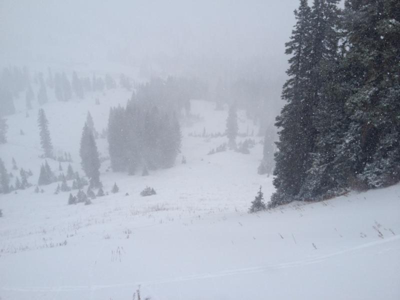 A few inches of fresh snow on a sun crust from yesterday at 8400 feet elevation.