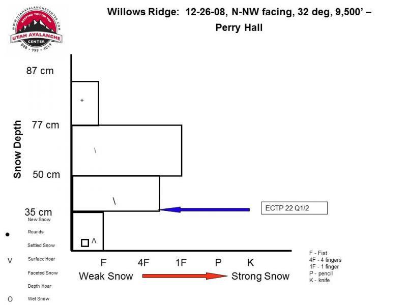 Snow pit dug on safe NNW test slope, 35 degrees, shady, 9500ft. ECT produced results at 2 from shoulder, clean q1 shear, q2 directly under shovel blade. As my partner was leaving the snow pit, a loud whoompf was heard and a crack from the top of our snow pit propagated 40 feet or so down the ridge line. Slab was heavy and sheared on 35cms of really poor facets at the ground. You can see the crack where her ski was on the 4th image, and the 5th shows the propagation of that crack. We got back on top of the ridge as fast as possible.