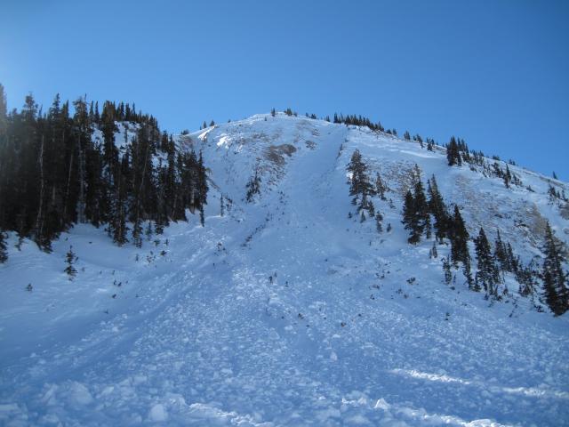 Old news, but a nice avalanche that occurred in the upper Mill Creek drainage during the last big cycle around january 17. Much of this area is shallow, rocky and has very weak snow conditions. This is a northeast aspect with a big broad fetch on the west side where west and southwest winds strip the snow onto the leeward side.