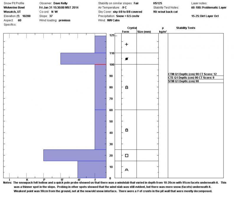 Skied terrain on all sides of the compass. Only questionable snow was on a NE facing slope in Wolverine Bowl at 10,200ft. As soon as we traversed from an easterly to a northerly aspect something didn't feel right. The snowpack felt hollow and a quick pole probe showed us that there was a windslab that varied in depth from 10-20cm with 95cm of facets underneath it. This was a thinner spot in the slope. Probing in other spots showed that the wind slab was still evident, but there was more snow (facets) underneath it.