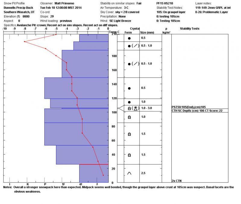 Profile site chosen with safety and accessibility in mind. Pretty solid snowpack here, all resting on basal facets of course. Would expect snowpack to be more shallow and weaker lower down in starting zones and tracks. Rounding the dominant process, though still weak (4F) faceted snow at the ground. The steeper part of the slopes right below this site all ran mid storm cycle, likely on the 9th. This crown is believed to have connected from Big Springs Bowl 5, all the way north through Bunnells drainage, and around the corner into Bridal Veil, roughly 3 miles long.