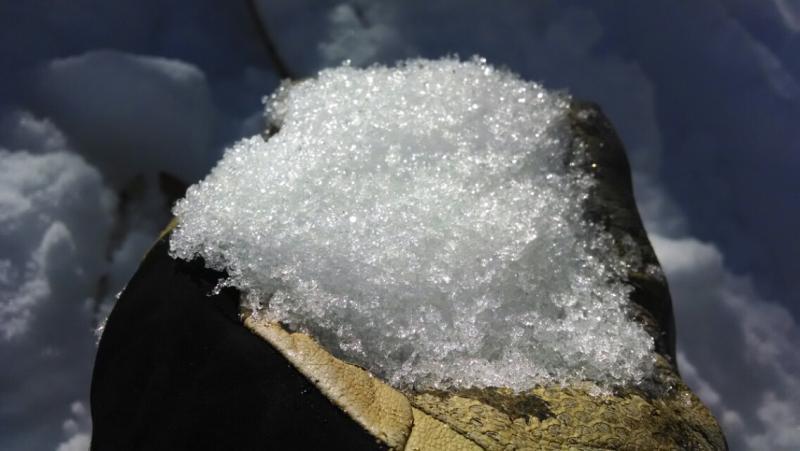 This is a picture of the advanced, persistent faceted snow that exhibits very poor (nonexistent, really) bonding to the recent (2 weeks worth) snowfall (which is effectively a relatively cohesive slab layer).