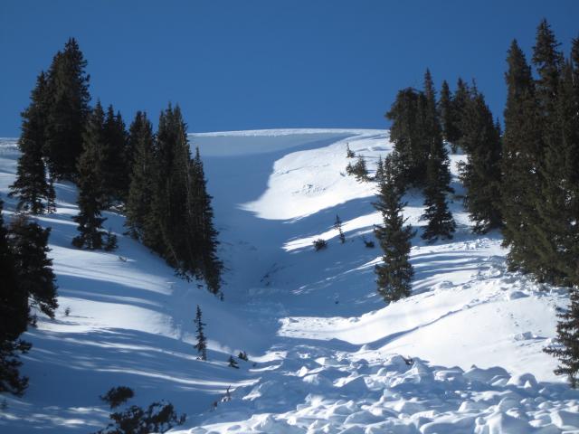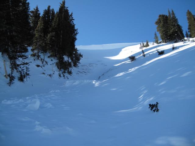 This avalanche may have happened during the big wind event at the first of the month when the area saw other big natural avalanches. I'm guessing strong southwest winds overloaded a thin weak snow pack on this northeast facing slope. It took out the seasons entire snow pack along with a few small evergreen trees. Not a real wide slide, but again the crowns on these deep avalanches this season continue to be real eye openers.