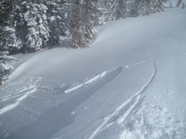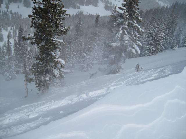 Fairly strong winds on the ridge tops today moving lots of snow around creating fresh wind drifts. Some of these wind slabs were getting a little on the unmanageable size in the more exposed terrain. Stomping around on the ridgelines where the winds were quite strong for a time this afternoon, some of the wind slabs were breaking out up to 2' in depth. Although shallow and only involving the new snow, in steep terrain these could start to pack a little punch and pile up the snow.