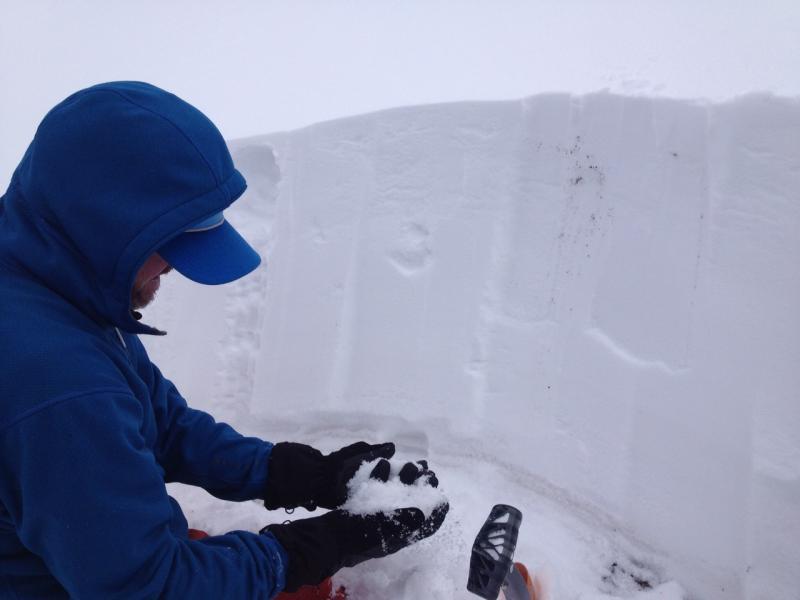 We wanted to do a couple column tests to see how the weak layer near the ground was behaving. During the first test we were able to get it to break on the weak layer on the first swing from the shoulder with a Q2 shear. The second test produced a break on the new snow interface on the 4th strike from the wrist. The weak layer near the ground broke on the third strike from the elbow with a Q2 shear. We didn't get a chance to do a ECT, but we did notice some propagation when we did the shovel test. The weak layer near the ground was about 4" but I foresee it sticking around for a while on the North facing aspects.