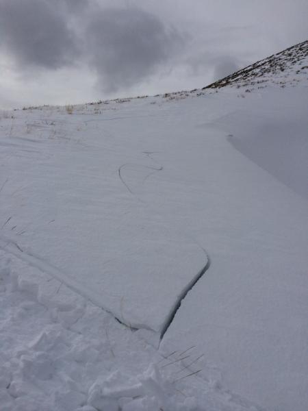 This cornice on the edge of Snake Creek was sensitive but it was on a gentle slope so it did not avalanche.