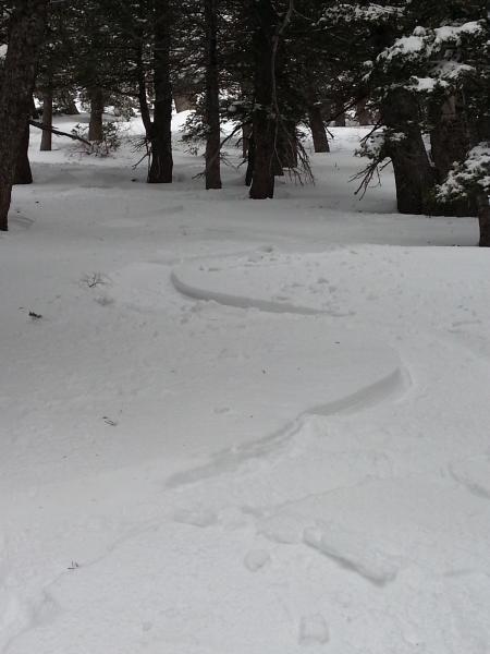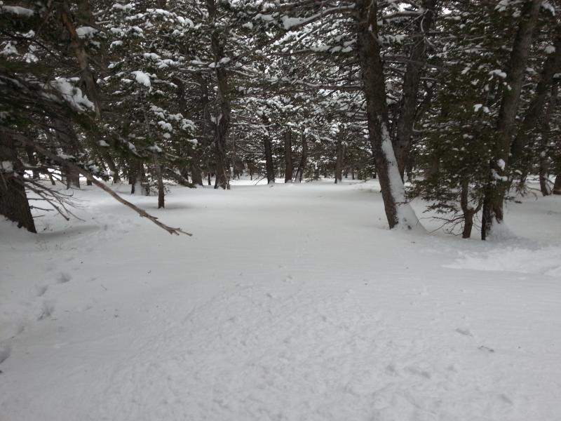 Below, much better snow, around 8600' in the trees, slope angles in the vicinity of 34 degrees. I traveled this same area yesterday, with no signs of instability either day. Have not been on much steeper terrain as of yet. The "Low" danger ratings below are for the terrain I was on today. The hazard would be higher in some of the steep-sidewalled gullies in the area.