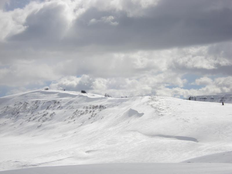 we found that we didn't really need skis or snowmobiles on most of this snow, we could walk on top. Saw no avalanches. It did stay cold most of the day with the wind. In wind sheltered areas, that were in the sun, we saw some melting but the cloud cover seemed to keep the snow from overheating. It was a good day for the kites.