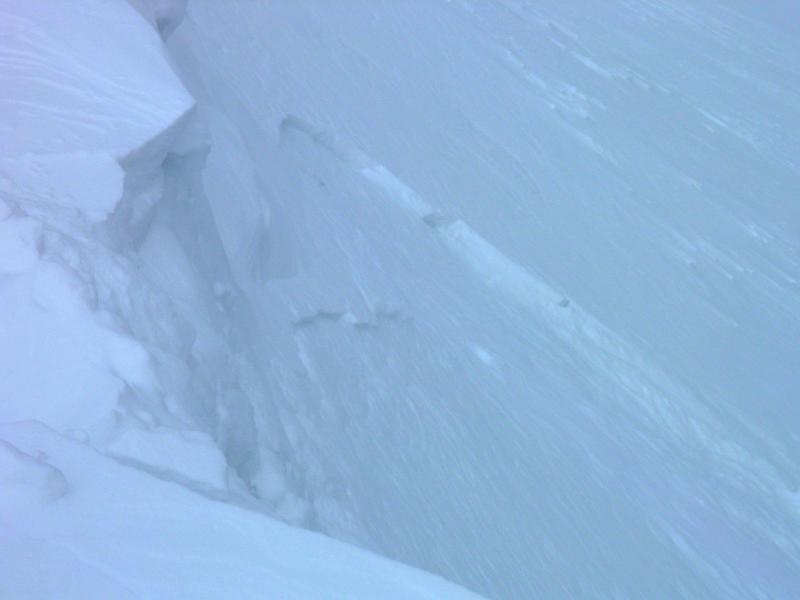 Went up to the PC Ridgeline fairly early to try to get some skiing in before the clouds and wind rolled in for the day, not early enough, upon reaching the ridge the wind was blowing fairly hard from the SE and the clouds were already rolling in. It was easy to see that the SE wind was cross loading the N-NE part of South Monitor, you could see the wind slabs forming on the skiers right of the peak. Noted some natural activity in the right corner pocket of South Monitor right off the bat, and the E-SE facing part of the bowl was completely scoured of new snow in the top. After a run I was walking the ridge heading for No Name and started to get some small wind slabs to crack out, one large wind slab cracked out sympathetically to a smaller one that I had triggered, figured that one was worth putting on the avy list. As a rule of thumb most of the wind slabs were shallow and not of much concern, but the larger one did get my attention. Of note is how fast the wind was loading the leeward slopes, by the time I was done screwing around taking photos of the larger wind slab, the one foot crown was almost filled in with a new wind slab. I would expect these wind slabs to become larger and a little more menacing if the wind continues to blow through the night, the bonding is not great in places with a steep angle and a hard bed surface, and the light density snow is easily transported by the strong winds. Photos some of the smaller wind slab activity from the day, the wind filling in shallow fresh crown, cracking on the ridge line.