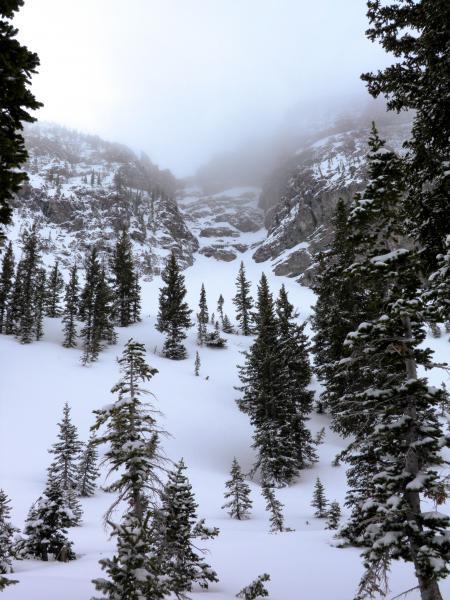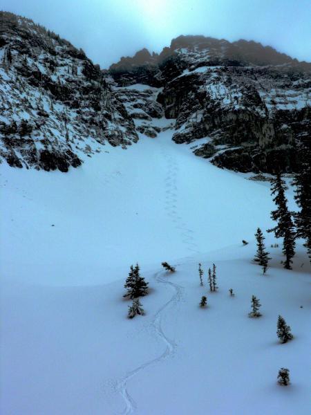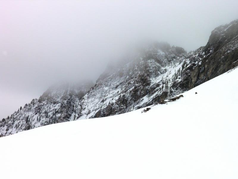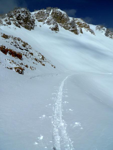 Went up to Devils Castle today since it has returned to it back country status., figured high north was the only option today. Did note some soft slabs that Alta was able to trigger in the new snow, and had that in the back of my mind when I was selecting my routes. I think the only activity was in wind effected terrain, dense wind slabs were noted on NE facing terrain features. With the sun poking through and some green housing taking place I would think that these wind slabs would settle out quickly. Skied many steep lines with no activity. Of note was the lack of a hard freeze in the old snow, I could punch my pole all the way down to the grip in most places and noted damp underlying snow. Photos, in and out weather, and some tracks in some half decent dense snow.
