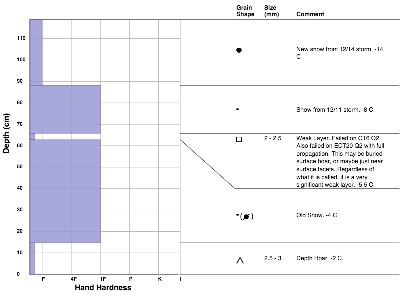 I noted two significant weak layers in my pit on a NNE aspect (see below). I believe these layers will remain persistent for quite some time. The best method for now is avoidance and safe travel practices.