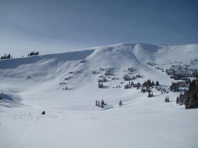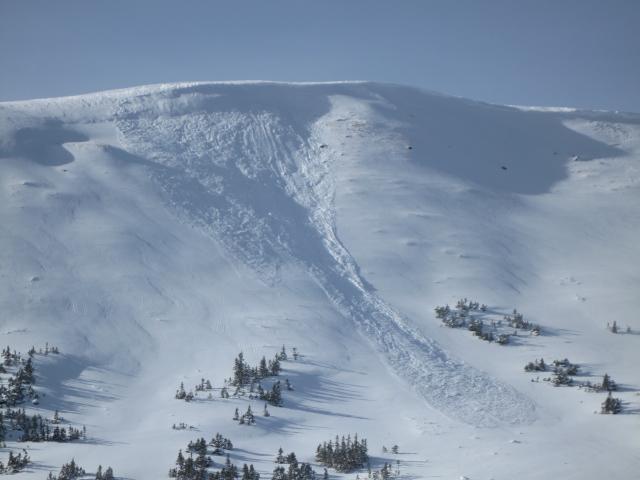 This natural avalanche on Double Hill was likely the result of strong south winds that overloaded this northeast facing slope.
