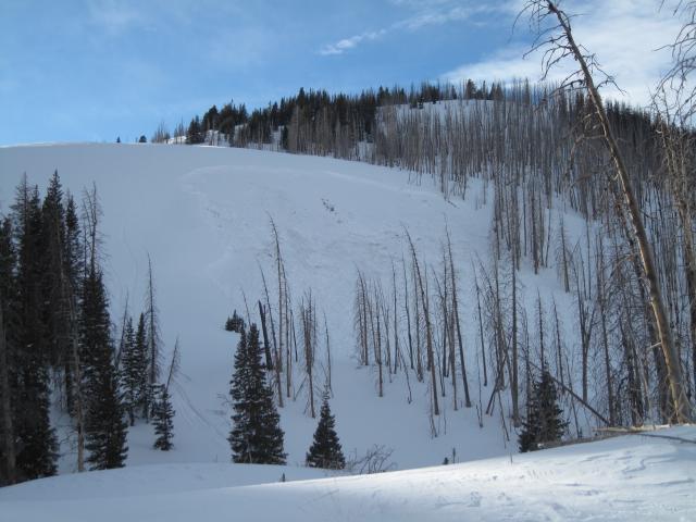 I believe this was a sled triggerd slide that may have occurred around the same time as the Double Hill Avalanche on 12/26. This slope has surprised many folks and is triggered quite often. At the top of the slope is a nice wind fetch that southwest winds get channled through and drift the snow onto this northeast facing slope.