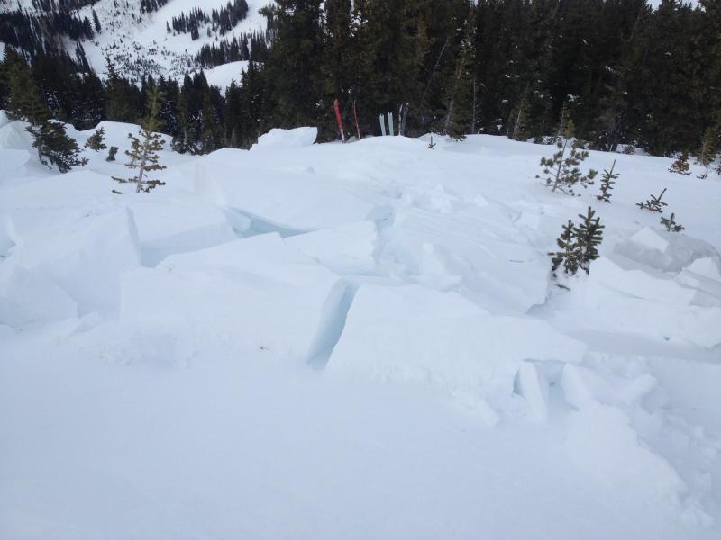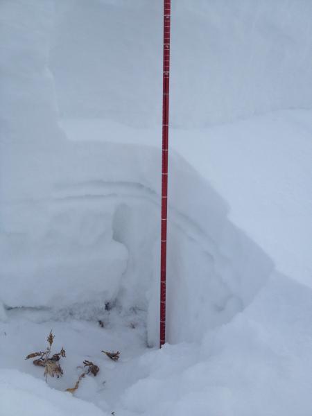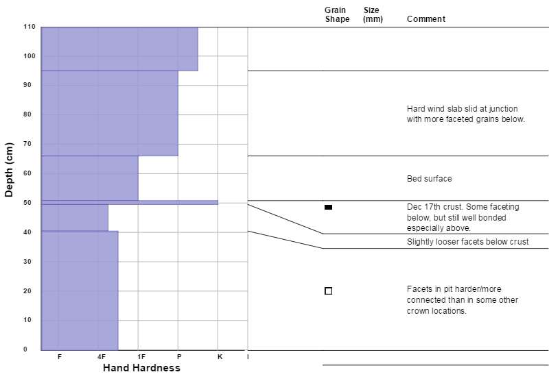 Goal of this quick crown profile from NNW facing 10,200’ was to determine on which layer the 1/1 Avalanche slid. We were interested to find the slide cracked not in the basal facets but rather 20 cm higher. The pencil hard slab slid above 12 cm of faceting (but not loose) snow sitting on top of the Dec 17 rime/freezing rain crust. Probing the bed surface between the crown and the point where skier stepped out and triggered the slide tells a similar story, with 45-70 cm of structured snow remaining on the slope. This in contrast to most of the length of the gunshot shoot which presumably pulled out in the Christmas cycle and is now covered by an unskiably thin veneer of faceted sugar. Look-out in old paths after the next storm!
