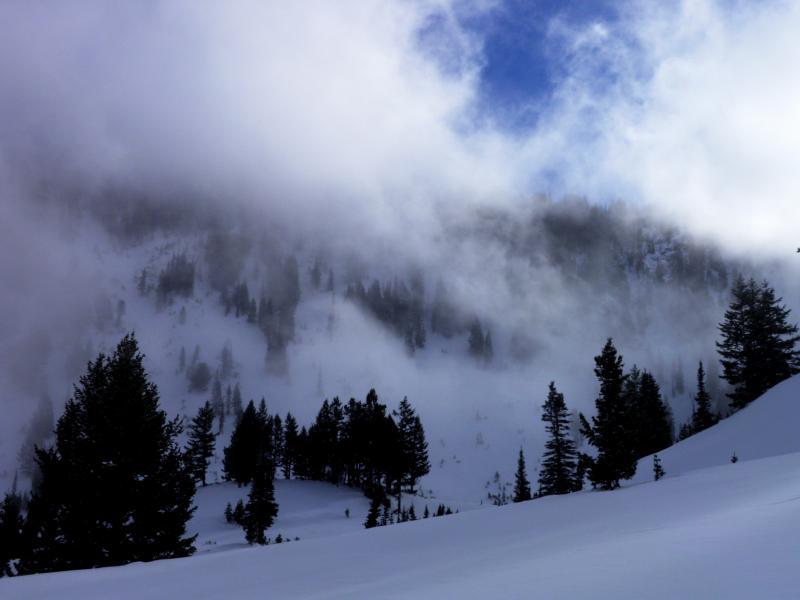 Photos: ECT in Toots, looking down Toots, in and out low lying clouds, and damp snow at about 8200ft