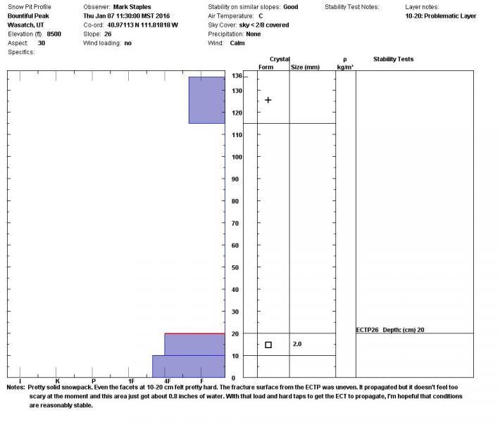 The second one on a NNE aspect at 8500 ft. Height of snow was 136 cm (4.46 ft). Didn't record hardness in this location. Mainly wanted to do another ECT. Getting one ECTP in one spot and a ECTX/N in another seems normal right now.