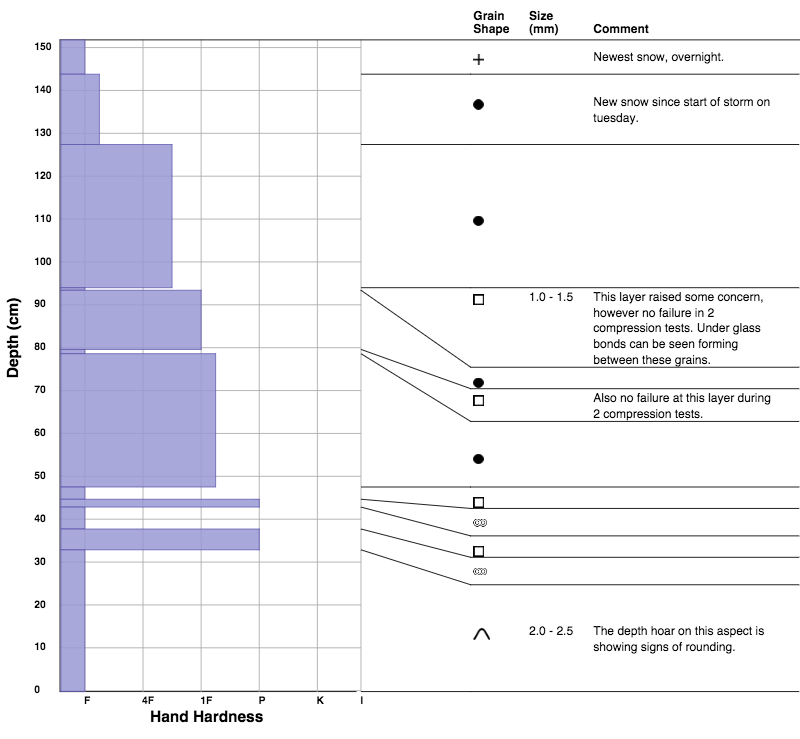 So if you look at this snow profile, the bottom looks like a total mess. Crust/facet/crust sandwich on top of depth hoar. The good news is that the depth hoar is rounding and is now at the bottom of 152 cm of snow. I expected failure in the mid pack facets at 90 cm and 80cm, but these layers did not fail. The grains at 90cm are definitely getting stronger and bonding to each other. We did get the column to fail below the pencil crust at 37cm. However this was only after the entire column had been isolated and it failed at CT23 Q3 and CT24 Q3. This is not a red flag in my book. Tomorrow's danger rating moderate, unless we see more snow and/or wind tonight.
