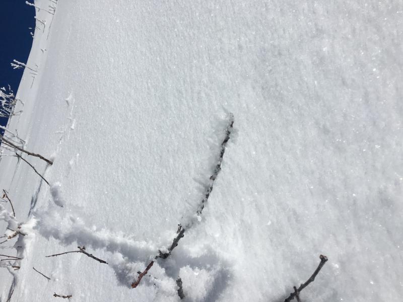 The high ridges had a week wind slab that was very prone to cracking and breaking. This wind slab was only about 1" in depth.
