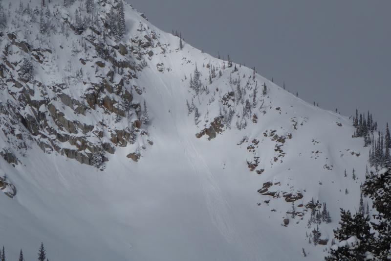 milly east side that drops to lake mary. saw this one triggered by two skiing the ridge, loose snow, low speed, ankle deep, lacked punch.