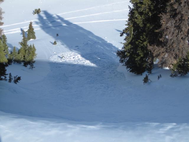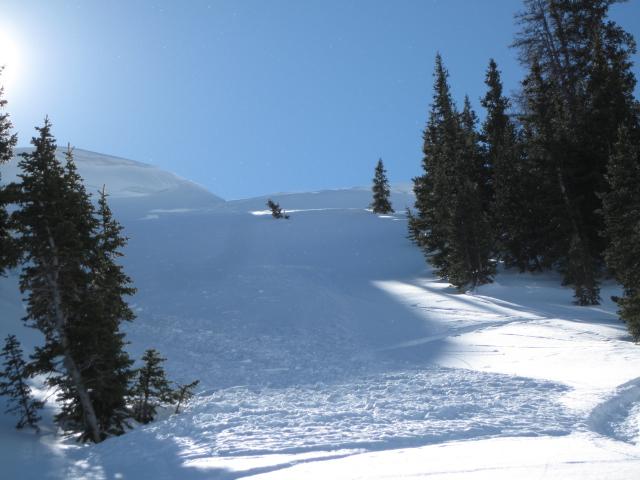 Found these few very isolated shallow wind slabs that some riders were able to trigger on high north facing slopes. These were manageable in size and in terrain like this where the small amount of debris can fan out, not a huge problem.