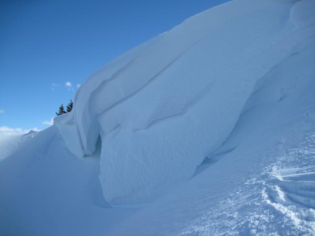 1. Looking down this steep north facing slope with bushes sticking out is the type of terrain where a person might still trigger a persistent slab avalanche. The snowpack has stayed thin and weak all winter long here and never gained much strength. 2. You don't want to camp out under one of these monster cornices as they begin to feel the heat and weight of all that wind blown snow.
