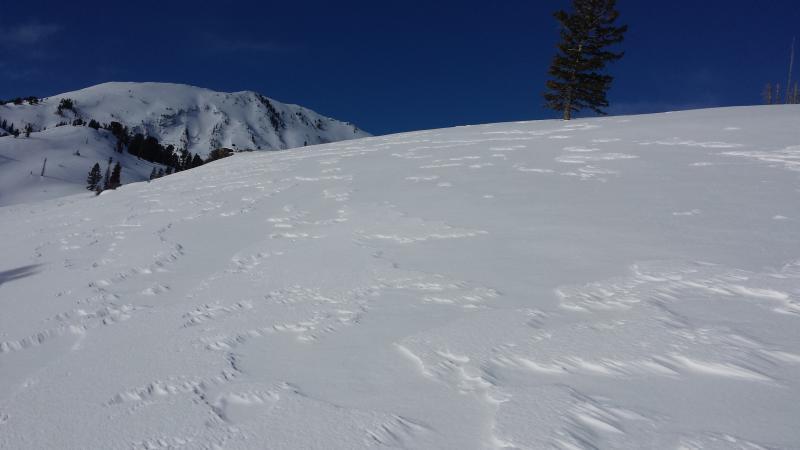 Today was another beautiful day. I found cold dry snow at upper elevations ( Above 8500 Ft) all morning than in the afternoon anything below 8500 ft on all aspects had become wet. There was a decent amount of wind loading today even at mid elevations. The Mid elevation wind slabs were the most reactive with two collapses and some cracking. But once above 8200 ft the wind slabs were not reactive. This could be due to the fact that upper elevation wind slabs have had time to settle and lower wind slabs were just finally starting to form today.