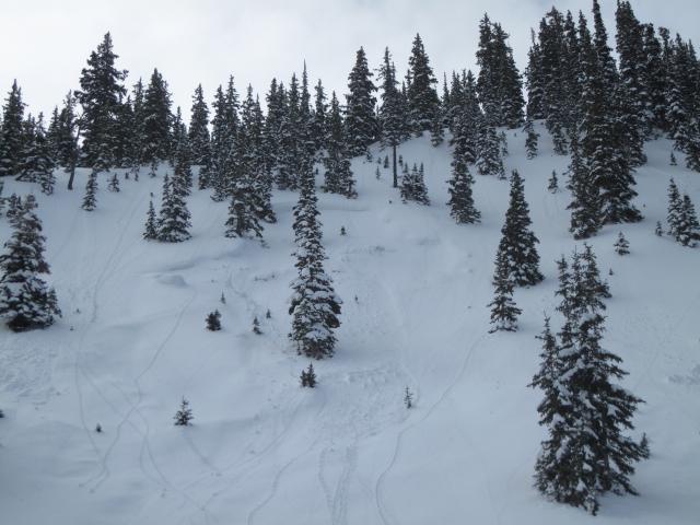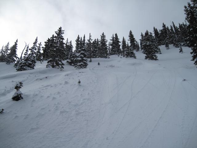 I stumbled on this very small natural avalanche in Gold Hill that likely happened during the stormy period. This is a repeater slide, back on 2/21 a larger pocket was triggered by a sledder on this northeast aspect. This area has stayed shallow and still had dry weak snow when I looked at it today. My guess is heavy wet dense snow from this past week overloaded the shallow weak snow and triggered this slide? Quite possible there are a few areas that still have this shallow weak snow, but not a real high probability.