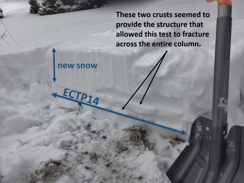 There was a very thin layer of depth hoar crystals at the ground but I don't think this will be a problem in this location. Very small faceted crystals at about 10 cm (4 inches) above the ground were the weakest layer. ECT's did not propagate at this spot but would propagate in any location that had a slightly harder layer in the snowpack. In the photo below there were two crusts that seemed to allow the ECT to propagate. Other locations had other types of hard layers.