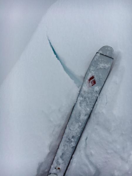 Lower photo - a little wind has stiffened the snow along the ridge line - but cracking was only localized
