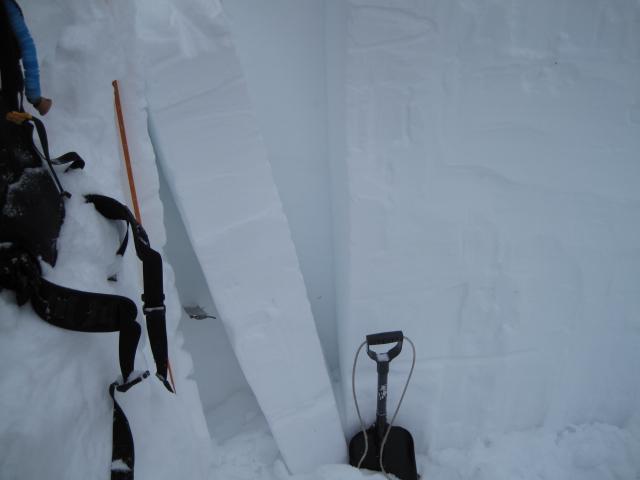 Interesting stability test, this column collapsed on the weak sugary snow near the ground with 16 taps from the elbow. I could not repeat it and the extended column test did not have similar results. I don't think this is alarming with how deep the snow pack is, but something to ponder? It could also be with a column this tall it may react this way?