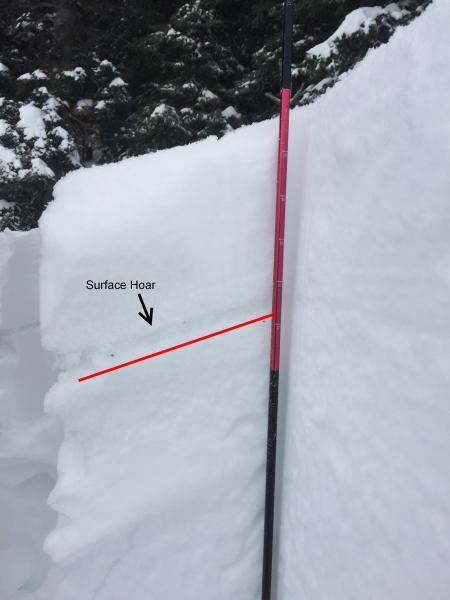 Buried surface hoar was easily visible in the photo above. As noted above, this is probably high spatially varible.