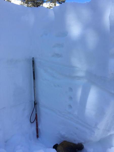 Photo 4: Rain crusts from 2/10 down 35cm and early Feb down 70cm. Total HS is 340 at 9500' in sheltered areas of upper AF. CTH BRK down 25cm on graupel above crust.