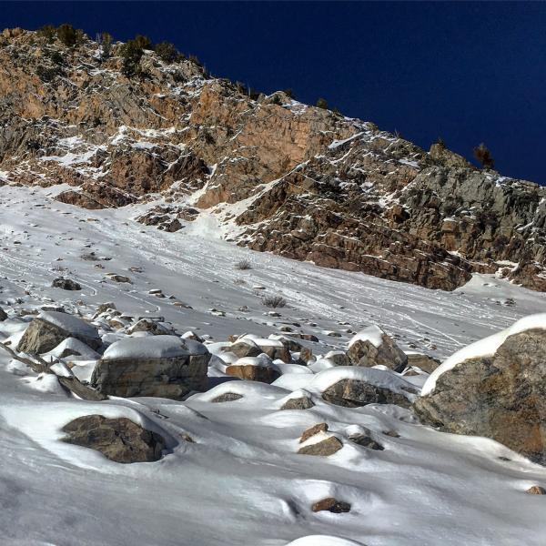 Took the long way to Cardiac Ridge from the BCC side to avoid the high N facing slopes coming from LCC and also avoiding rocks as much as possible. I had a look at Cardiac Ridge before the latest storm and THE DEVILS IN THE DETAILS, the skiers right side under the main line had old snow from earlier in the year and today the snow on that part of the ridge looked wind affected and slabby, we stuck to the due east facing on the skiers left of the ridge to avoid the storm slab sitting on facets set up that the more NE facing part of the slope had. No cracking or collapsing or any sighs of instabilities were noted except minor wet activity on the SE facing rocks. There also was no sign of any prior avalanche activity in the whole drainage including Cardiac Bowl and LSB.