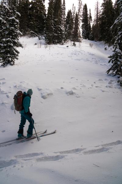 We found one natural avalanche that ran during the storm that crossed the White Pine road just on the up canyon side of Columbine Bowl (aka Birthday Chutes). It broke about 1.5 feet deep on a 40 degree, NW facing slope at 8,800' and was about 150' wide. Here, Susi is standing on the road with the avalanche above.