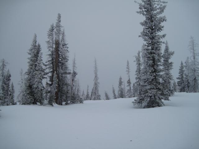 Low clouds and moist air created a thin rime crust in the higher terrain creating frosted trees and limited visibility.