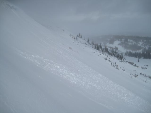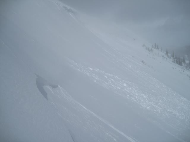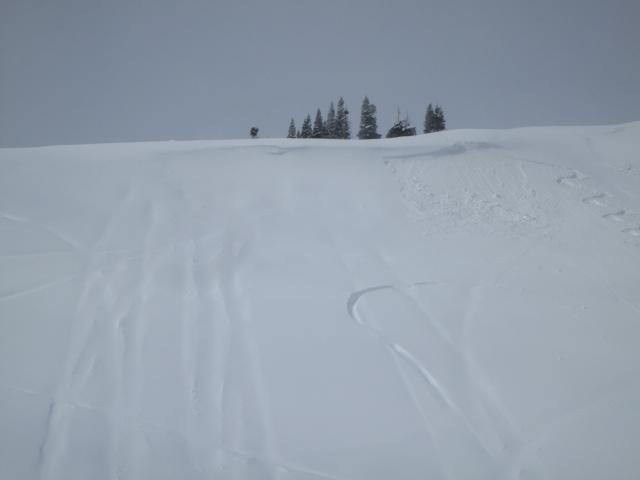 A few photos of shallow soft wind slabs that are easily triggered just off the ridge lines. These were very manageable early today, but will likely become a bit more of an issue with increasing winds and more snow this evening.