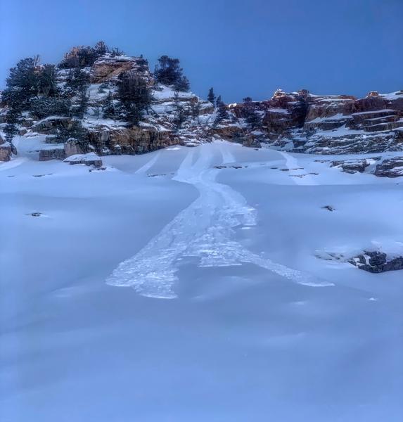 Photos: wind slab below the rock slabs, sluffing in steeper terrain, new snow only wind slab skier released and the wind still moving snow on top of Superior